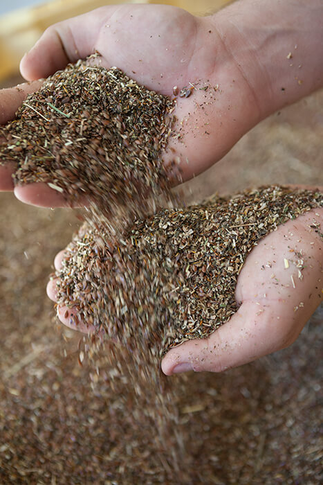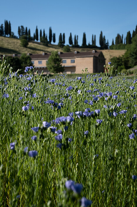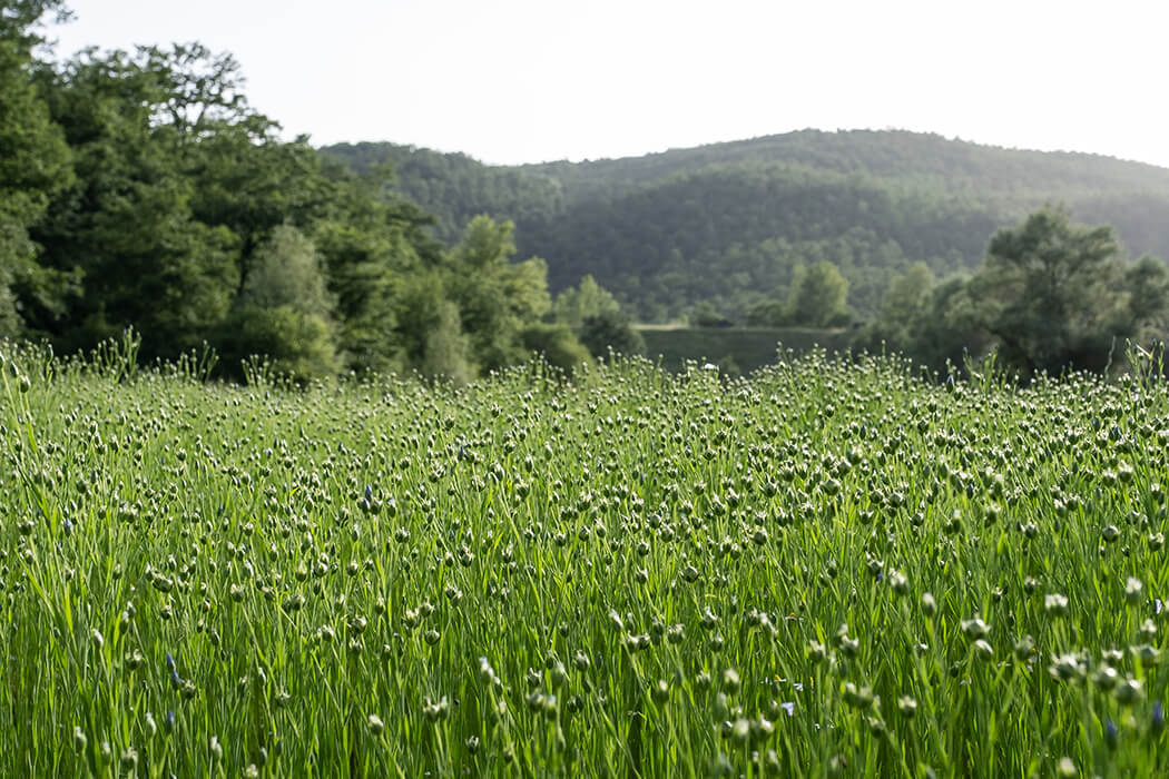 Linseed or common flax with its pretty blue flowers and bell-like seed pods was widely cultivated for tens of centuries in Ethiopia and in Egypt. The pale yellowish linseed oil has the highest source of omega-3 fatty acid in vegetable oils and is in demand as a nutritional supplement. Reschio has been growing linseed biodynamically for several years and this year will be cold pressing the seed to produce this beneficial oil.